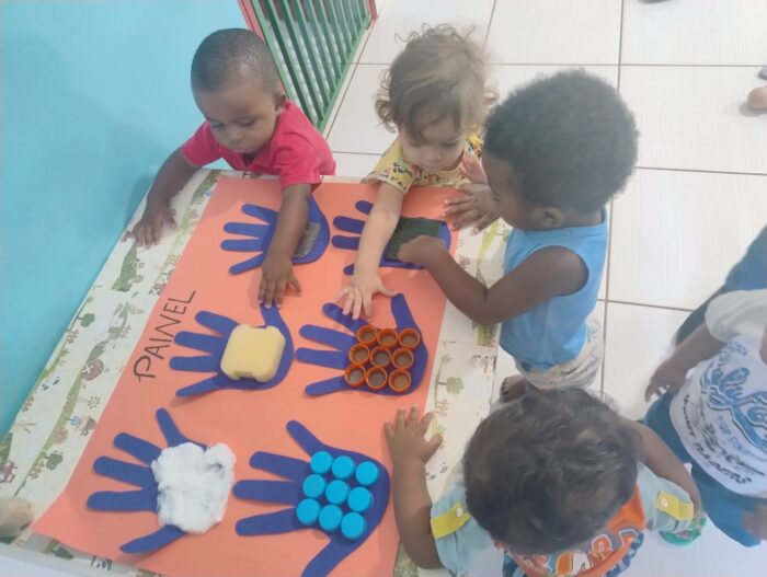 Com o uso de diferentes grãos como arroz, soja e feijão, os pequenos exploraram texturas e cores.